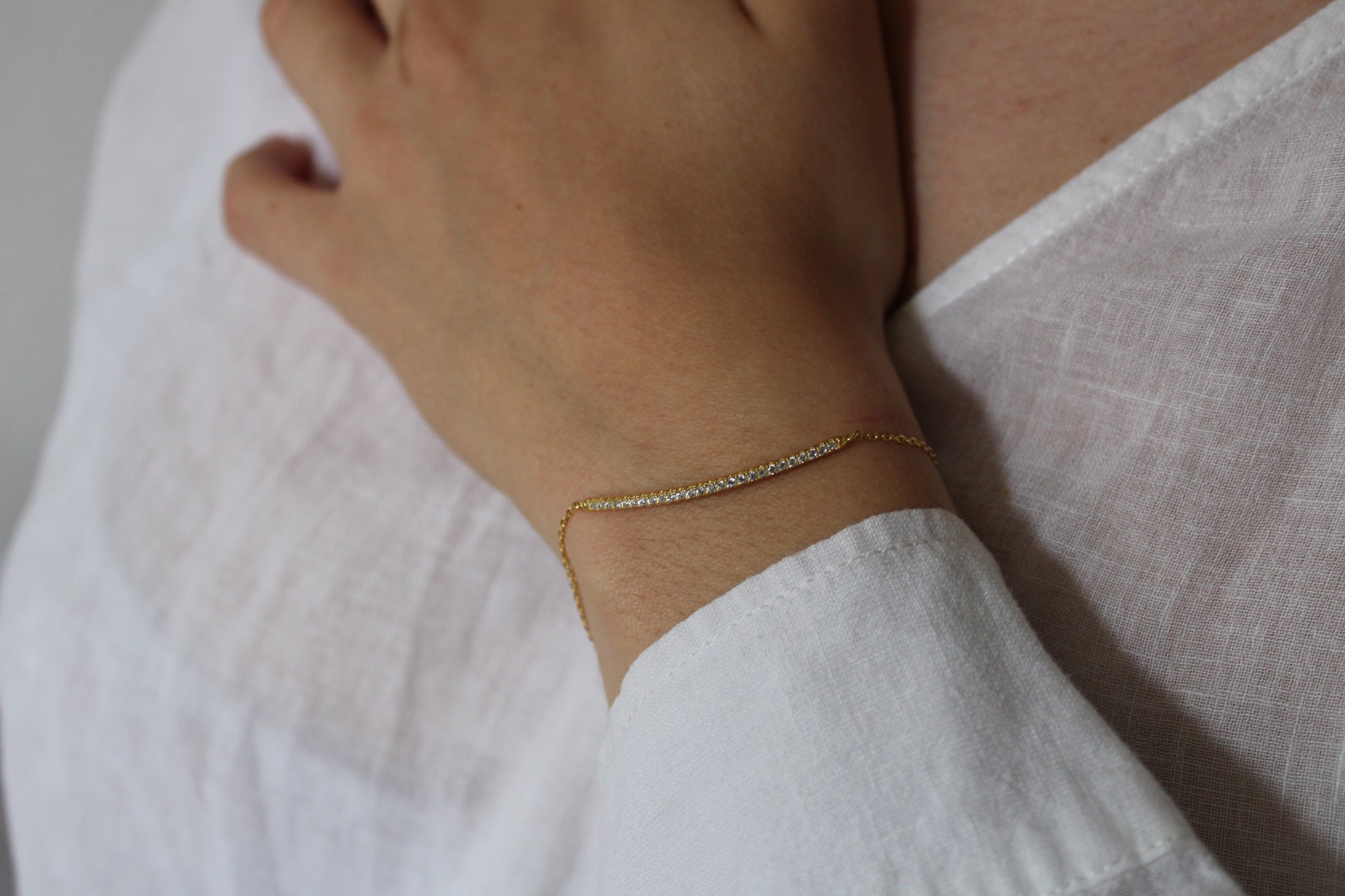 Neros Ines bracelet is one of our most dainty pieces. Crafted in Gold vermeil the studded bare gives your wrist extra shimmer without being too loud. Stack this with other bracelets or lay it along your favourite time piece.
