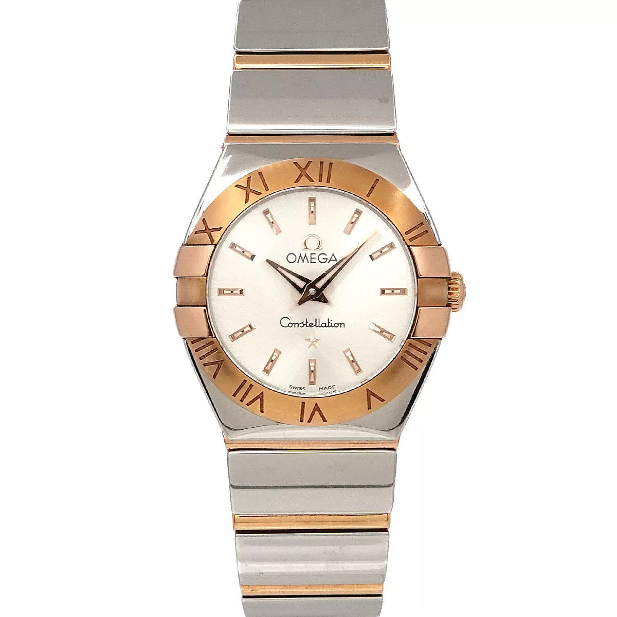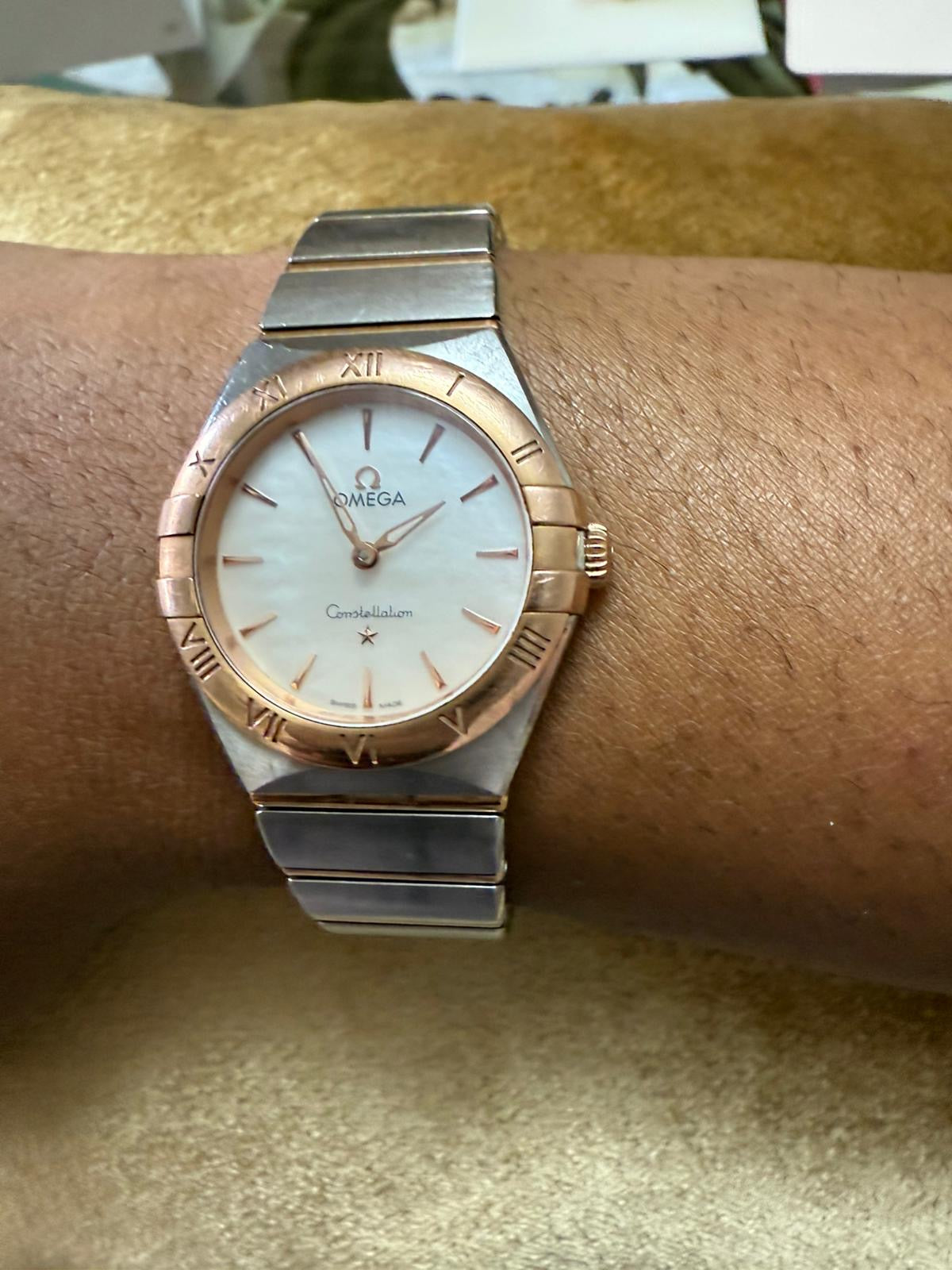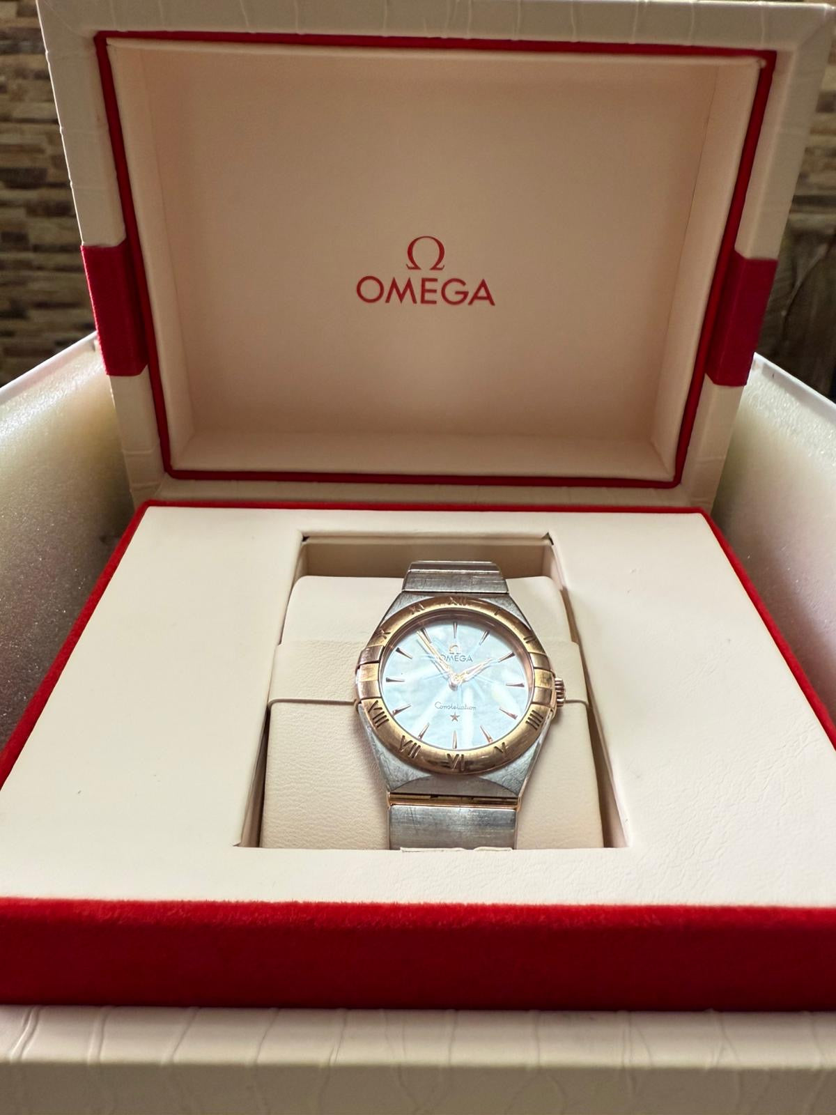 Experience timeless elegance with this pre-owned Omega Constellation women’s watch. Featuring a stainless steel and rose gold bezel with Roman numerals and a mother-of-pearl dial, it blends classic design with everyday luxury.